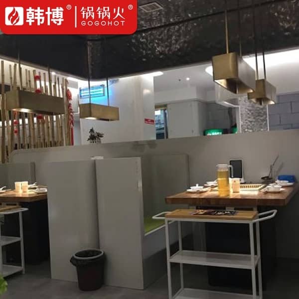 合肥重庆巴倒烫火锅夜宵无烟火锅桌案例是与韩博锅锅火合作定制韩式实木台面无烟火锅桌4人卡座、8人圆桌方锅以及无烟净化设备不锈钢净化箱体、配套电磁炉、铜锅圈等。店铺营业执照名称为合肥庐阳区派巴倒烫火锅店,合作时间为2018年7月.