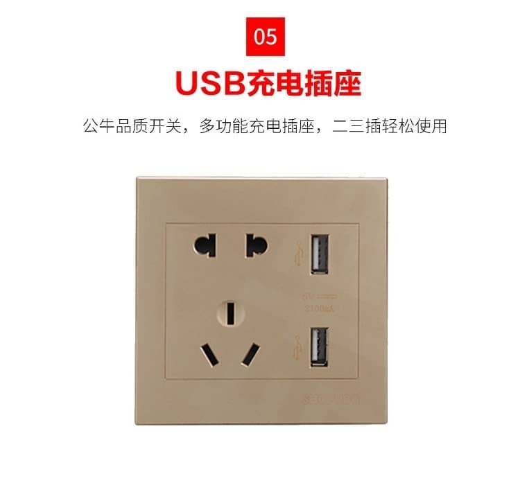 5、USB充电插座采用公牛多功能充电插座,二三插轻松使用。